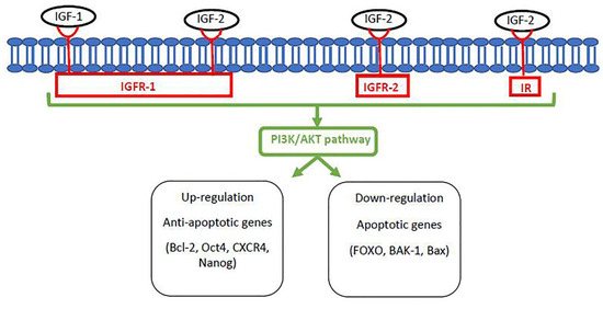 Schematic of the canonical pathway of apoptosis regulation by signaling of the IGF system. IGF-1 binds to insulin-like growth factor receptor 1 (IGFR-1); IGF-2 binds to IGFR-1, IGFR-2, and insulin receptor (IR), and two factors activate the PI3K/AKT pathway, up- and down-regulating expression of anti-apoptotic and apoptotic genes, respectively.