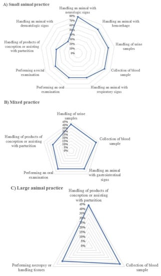 | Handling an animal with gastrointestinal signs | LA (n = 36) | 0% | 22% | 33% | 45% |