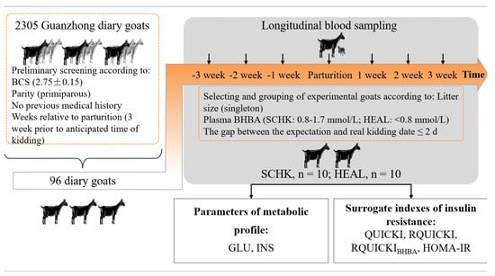 The study was conducted in Western China (106°55′57″ E, 34°48′41″ N) at the experimental farm of Northwest A&F University (Shaanxi Province, China) between January and March in 2019. The protocol is schematically presented in Figure 1. Two steps were used to screen and group animals. In the first step, 2305 Guanzhong dairy goats on the farm were subjected to estrous synchronization in September so that kidding occurred in February. Then, 96 Guanzhong dairy goats were enrolled and chosen from 2305 Guanzhong dairy goats according to body condition score (BCS) (2.75 ± 0.15, mean ± SEM), parity (primiparous), expected kidding date (within the first week of February), and no medical history. The second step was to select these experimental goats by the litter size of singleton and allocate them to one of the following two groups according to their plasma BHBA concentrations: SCHK (n = 10; BHBA = 0.8–1.7 mmol/L) or HEAL (n = 10; BHBA < 0.8 mmol/L) [6,17,18]. The goats were reared in a free-stall barn from 3 weeks prior to the anticipated time of kidding until 3 weeks after kidding. All goats were fed the same diets comprising a base ration fed as a TMR, which was formulated to meet the nutrient requirements of dairy goats during the transition period according to the Nutrient Requirements of Small Ruminants (National Research Council, 2007). The goats had free access to water, and diets were fed ad libitum during the experimental period. The diet was offered twice daily at 0730 and 1530 h.