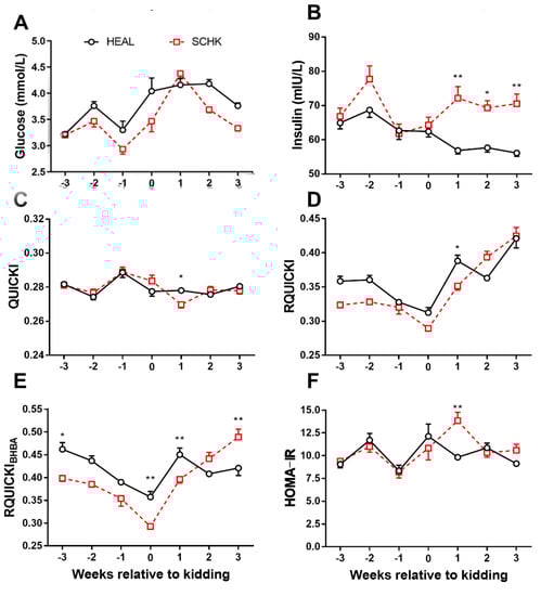 Figure 2. Changes in the concentrations of glucose (A), insulin (B), QUICKI (C), RQUICKI (D), RQUICKIBHBA (E), and HOMA-IR (F) in goats with SCHK and HEAL goats during the peripartum period. * p < 0.05, ** p < 0.01. Values are presented as means ± SEM from 10 goats per group (n = 10).