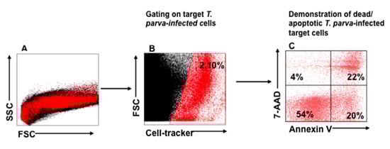 Gating strategy used to isolate labeled T. parva-infected target cells for analysis of CTL-mediated killing. (A) Representative mixture of CTLs and autologous, irradiated T. parva-infected cells (target cells) labeled with CellTracker Deep Red, annexin V, and 7-AAD after co-incubation for 6 h, displayed in SSC vs. FSC. (B) Selective gate used to isolate labeled cells for analysis displayed in FSC vs. CellTracker. (C) Gated infected cells displayed in 7 AAD vs. annexin V to show the proportion of infected cells undergoing apoptosis. The cells in the lower left quadrant show the proportion of live target cells remaining after incubation with CTLs for 6 h. The lower right quadrant shows the proportion of cells undergoing the initial stages of apoptosis (annexin V+/7AAD−). The upper right quadrant shows the proportion of target cells in late stages of apoptosis (annexin V+/7AAD+), and the upper left quadrant shows the proportion of target cells undergoing necrosis/non-apoptotic mechanisms of death (annexin V−/7AAD+).