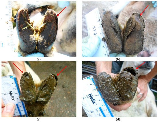 (a) Discrete separation of the abaxial hoof wall at the white line (red arrow); (b) Discrete discolouration and separation of the abaxial hoof wall at the white line (red arrow); (c) Extensive separation at the toe and along the abaxial hoof wall on both paired claws (red arrows); (d) Major cavity ‘pocket’ with loss of hoof wall integrity (red arrow).