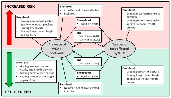 A summary of the risk factors for WLD presence at foot-level and number of feet affected per ewe is presented in Figure 3.