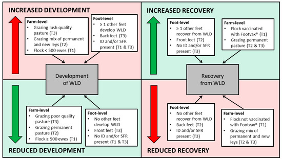 As with any longitudinal field survey, there are limitations that may affect interpretation of results. This was a study of four commercial sheep flocks, and as a result, the generalisability of our data is impacted by the particular farms chosen and findings should be interpreted with caution. Recall bias, farmers’ interpretation and resultant observer bias could impact estimates of the pasture variables obtained, and whilst this data is important, it is a very crude measure, and within-month variation will occur. More frequent scoring of pasture conditions, by a single observer, is warranted in future studies. Furthermore, objective measurements of soil temperature and moisture could provide greater detail of underfoot conditions at different time points on each farm. Unobserved differences between flocks were controlled for by including farm as a random effect in all models. Additionally, due to the nature of the study, the direction of causality of the associations between risk factors and WLD cannot be determined, although the findings do provide insight into the various factors at play. We were also unable to generate precise estimates of the average length of time sheep spent in each WLD state. We recognise that multiple transitions in WLD states could occur within the transition periods, particularly T2, and propose further prospective investigation in order to fully determine the time frames for WLD lesion development and resolution. Further studies could intensively observe sheep, with higher frequencies of uniform sampling points, to achieve data suitable for multilevel multistate discrete time event history models, which would prevent the fitting of separate models for each transition period. This would also account for the correlation between transitions, elucidating whether the duration of an episode of WLD affected subsequent risk of recovery. Furthermore, inspecting feet for clinical signs of chronic laminitis may prove useful in understanding its impact on WLD.