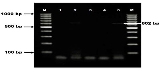 Molecular detection of C. difficile tcdA gene among diarrheic dogs and cats. Lane M: DNA ladder (100 bp); lane 1: negative control; lanes 2,5: positive samples showed specific band at 602 bp; lanes 3,4: negative samples.