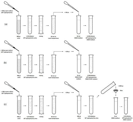 Experiment 1: Process of culture preparation (a) in EMJH medium, (b) in EMJH-STAFF medium and (c) with filtration of each urine sample.