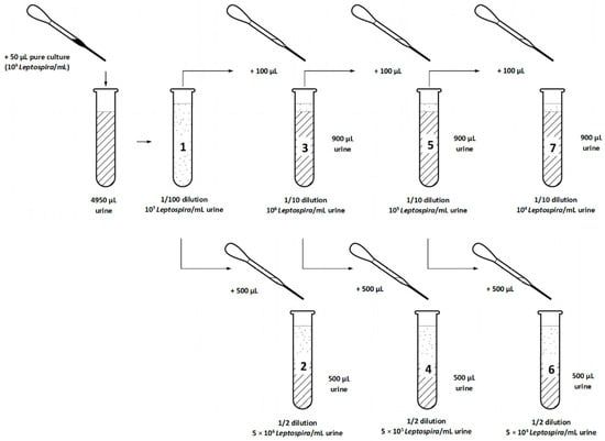 Experiment 2: Steps of preparation of seven dilutions of pure culture (109 Leptospira/mL) in each of ten selected urine samples before transfer into culture medium (EMJH-STAFF).