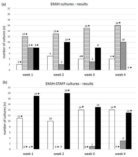 Number of (a) EMJH and (b) EMJH-STAFF cultures from spiked swine urine samples with the microscopic (dark field 200×) evaluation results at week one, two, three and four post inoculation differentiated into the following categories: □ no Leptospira/no contamination, ▤ contamination, ▨ Leptospira plus contamination and ■ pure Leptospira. ★ significant relationship between the result category at the corresponding week of evaluation and culture (EMJH and EMJH-STAFF), (p < 0.01).