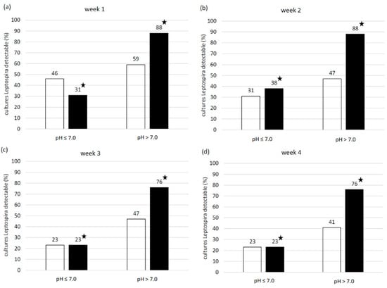 Percentage of □ EMJH and ■ EMJH-STAFF cultures from spiked swine urine samples with pH ≤ 7 and > 7 and microscopically (dark field, 200×) detectable Leptospira with and without contamination at (a) week one, (b) week two, (c) week three and (d) week four post inoculation. ★ significant relationship between urine sample pH and detectability of Leptospira in cultures at the corresponding week of evaluation (p < 0.01).