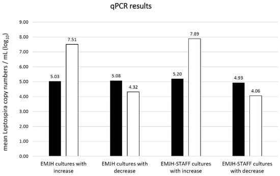 In both EMJH and EMJH-STAFF cultures, the mean copy number of Leptospira at day two after inoculation was around 105 copies/mL (Figure 5). At this point in time, there was no significant difference (p = 0.09) in the copy numbers observed between EMJH and EMJH-STAFF cultures. In ten EMJH and 15 EMJH-STAFF cultures a decrease of Leptospira copies/mL was seen, while an increase was seen in four EMJH and fifteen EMJH-STAFF cultures 28 days after inoculation. All cultures with a copy-number increase belonged to the microscopically determined categories 2 or 3, with the exception of one EMJH-STAFF culture assigned to category 1. All cultures with a copy-number decrease belonged to category 0 in microscopic evaluation with the exception of one EMJH-STAFF culture assigned to category 1. Cultures that showed Leptospira increase at 28 days after inoculation reached genome copy numbers of >107 copies/mL, whereas cultures with Leptospira decrease remained clearly below 105 copies/mL (Figure 5). EMJH-STAFF cultures reached significantly higher copy numbers after 28 days than EMJH cultures (p < 0.01). The correlation coefficient between the microscopically determined categories and those determined by qPCR was 0.72 for EMJH, 0.84 for EMJH-STAFF and 0.84 for EMJH together with EMJH-STAFF cultures.