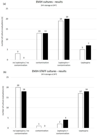 Number of microscopic (dark field, 200×) evaluations including week one, two, three and four post inoculation of (a) ten EMJH and (b) ten EMJH-STAFF cultures from spiked swine urine samples stored for 24 h at 4 °C □ without and ■ with added buffer (PBS) and differentiated into the following categories: no Leptospira/no contamination, contamination, Leptospira plus contamination and pure Leptospira.