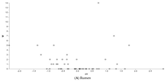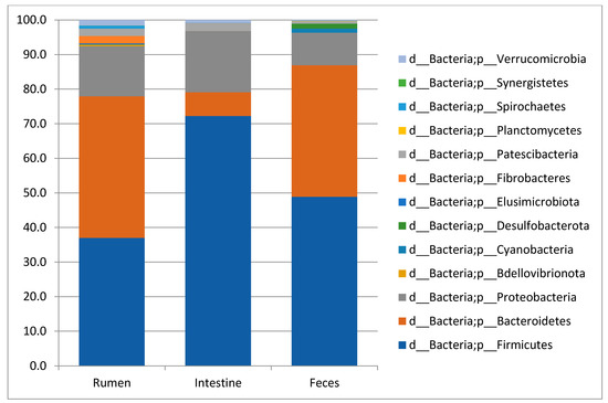 The Permutational Analyses of Multivariate Dispersions (PERMDISP) indicated that there was no heterogeneity in multivariate dispersion within groups, either in the rumen (PERMDISP—Bray–Curtis: F-value = 0.190, p-value = 0.683; Unweighted UniFrac: F-value = 1.403, p-value = 0.285; Weighted UniFrac: F-value = 0.987, p-value = 0.354), or intestine (PERMDISP—Bray–Curtis: F-value = 2.590, p-value = 0.054; Unweighted UniFrac: F-value = 1.509, p-value = 0.075; Weighted UniFrac: F-value = 0.959, p-value = 0.411) or feces (PERMDISP—Bray–Curtis: F-value = 3.485, p-value = 0.075; Unweighted UniFrac: F-value = 4.231, p-value = 0.092; Weighted UniFrac: F-value = 0.153, p-value = 0.688).