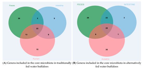 Core microbiota at the Genus level of the rumen, large intestine and feces from differentially fed water buffaloes. Genera shared by at least 80% of samples included in each body site: (A) traditionally fed water buffaloes (n = 10); (B) alternatively fed water buffaloes (n = 10).
