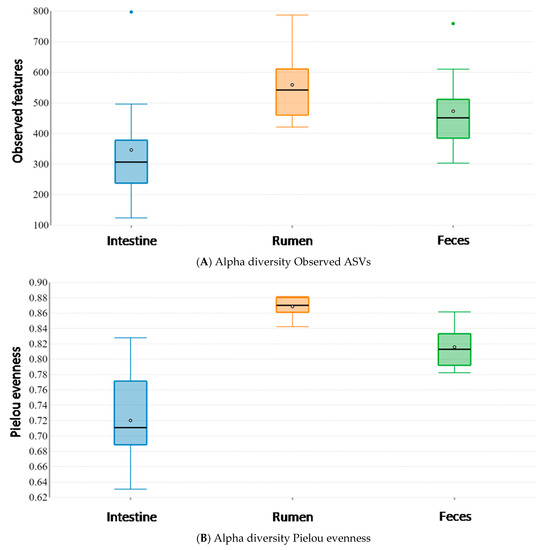 Alpha diversity analysis among the rumen, large intestine and feces from traditionally fed water buffaloes (n = 10). Differences in alpha diversity metrics among different body sites: (A) Observed ASVs; (B) Pielou evenness index.