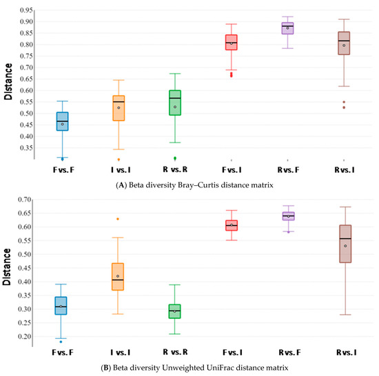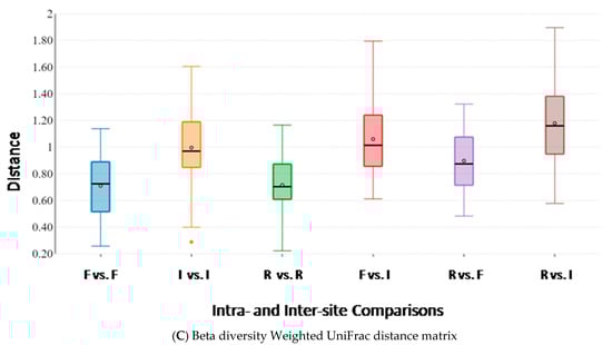 Beta diversity box plots within and between body sites from traditionally fed water buffaloes (n = 10). Distances calculated with different matrices: (A) Bray–Curtis, (B) Unweighted UniFrac and (C) Weighted UniFrac. The letter F indicates feces, I indicates large intestine, R indicates rumen.