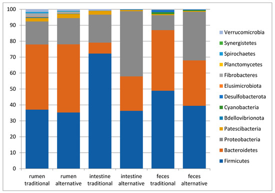The comparison of the observed ASV numbers between traditionally and alternatively fed water buffaloes for each body site displayed comparable numbers of observed ASVs for each body site (343.2 ± 69.5 vs. 365.6 ± 108.6 in the rumen, 215.9 ± 112.5 vs. 274.1 ± 147.9 in the large intestine and 325.1 ± 81.2 vs. 327.7 ± 100.2 in feces, respectively, in traditionally and alternatively fed buffaloes). The taxonomic analysis for each body site between traditionally and alternatively fed water buffaloes indicated that, in all samples from both groups, the three most abundant phyla were Bacteroidetes, Firmicutes and Proteobacteria, but with different relative abundances among body sites (Figure 5). In the large intestine and feces, the ratio of Firmicutes and Bacteroidetes (F/B ratio) appeared lower in alternatively fed animals when compared to the traditionally fed ones (Figure 5).