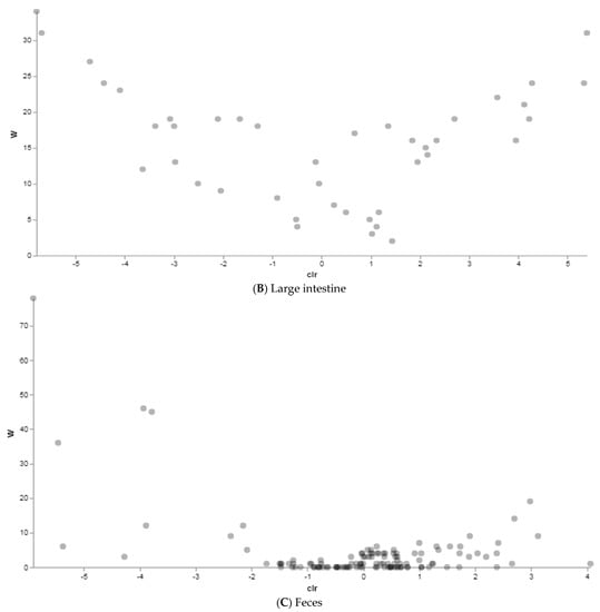After sequencing, reads pre-processing for quality control was performed by DADA2 (DADA2 denoise-pyro plugin) to denoise, remove primers, de-replicate single-end sequences, remove chimeras and exclude low quality reads [28,29]. Based on the quality control check, filtered and de-noised reads were resolved to high-resolution Amplicon Sequence Variants (ASVs), which represent, as closely as possible, the original biological sequence of the sequenced amplicon [28]. The downstream taxonomic analysis at phylum, family and genus level was carried out by the QIIME 2-2020.6 software. For this purpose, multiple sequence alignment of representative ASVs sequences was carried out using the QIIME 2 cluster-features-closed-reference tool (qiime v search cluster-features-closed-reference plugin) [30,31,32]. ASVs were taxonomically classified using a Naïve Bayes classifier, pre-trained on SILVA 138 reference sequences clustered at 99% similarity (QIIME2 feature-classifier classify-sklearn plugin) [33,34]. FastTree [35] software was then used to infer unrooted and subsequently rooted maximum-likelihood phylogenetic trees representing the phylogenetic relatedness of ASVs (QIIME2 phylogeny align-to-tree-mafft-fasttree plugin). Chloroplasts and not classified sequences were excluded from the analysis, given that the total number of found sequences was negligible. After reads pre-processing of the 60 samples included in the study (20 rumen content, 20 large intestine content and 20 feces), the total number of sequences was 15,338,707, with a mean number of sequences of 248,294 per sample in rumen content (median number: 228,192 sequences, minimum number: 123,226 and maximum number: 471,806), 238,019 mean number in large intestine content (median number: 191,351, minimum number: 72,802 and maximum number: 421,725), and 280,621 mean number in feces (median number: 224,171 sequences, minimum number: 122,034 and maximum number: 829,777). Negative controls were sequenced in order to evaluate the presence of eventual contamination [27,28,29]. All the features found in negative controls (Supplementary Table S1) were either absent or present in a negligible number of analyzed samples. Based on this evidence and the best practices for analyzing microbiomes [27,28,29], and in consideration of similar studies in the literature [36,37], we decided to filter out low abundance ASVs by removing all the features with a minimum frequency <150. Following taxonomic analysis, the analysis of the composition of microbiomes (ANCOM) implemented through the QIIME2 ANCOM plugin was carried out to evaluate the presence of statistical differences of population abundance between groups. ANCOM calculates pairwise log-ratios between combinations of taxa and considers how many times (W) the null hypothesis (no difference between each pairwise comparison of taxa) is violated [38]. The ANCOM algorithm determines significance by plotting calculated F-statistics on the x-axis and W-statistics on the y-axis. The F-statistics is a measure of the effect size difference for a particular species between the study groups (diet in our case), and the W-statistic is the strength of the ANCOM test for the tested number of species, with W value representing the number of times that the null hypothesis (no difference between groups) is rejected. To perform this analysis the taxonomic features occurring in fewer than 10 samples or with frequencies below 50 were removed in the input step. Identification of specific features of interest was performed by BLAST analysis [39]. Alpha diversity analysis between body sites, based on observed ASVs (a measure of ASVs abundance) and Pielou evenness index (a quantitative measure of relative evenness of species richness) was performed using the Mann–Whitney test for unpaired samples. Samples from different body sites were also analyzed for beta diversity Principal Coordinates Analyses (PCoA) using Bray–Curtis (a quantitative measure of community dissimilarity), unweighted (a qualitative measure of community dissimilarity incorporating phylogenetic relationships between the features) and weighted (a quantitative measure of community dissimilarity incorporating phylogenetic relationships between the features) UniFrac distances matrices in the QIIME 2 software [40]. Group’s dissimilarity was tested both by Permutational Multivariate Analysis of Variance (PERMANOVA) and Permutational Analysis of Multivariate Dispersions (PERMDISP). PERMANOVA is a non-parametric multivariate statistical test used to assess whether the centroids and dispersion of the groups are equivalent for all groups. The null hypothesis of this test is that the metric centroid does not differ between groups. PERMDISP is a multivariate test that evaluates the homogeneity of dispersion within groups [41]. The null hypothesis of this test is that the average within-group dispersion is the same in all groups.