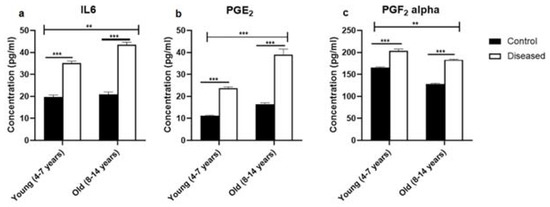 The levels of IL-6 and prostaglandins (mean ± SEM) in serum of mares (young (4–7 years) and old (8–14 years)) with endometritis compared to control ones. (a) The serum concentration of IL-6. (b) The level of PGE2 in serum. (c) The serum level of PGF2α. Statistical significance was defined as values of p < 0.05. Statistical differences among groups are marked with asterisks (** p < 0.01, *** p < 0.001).