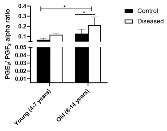 Serum concentrations of IL-6 were higher (p < 0.001) in diseased mares (both young and old) compared to the control ones. In the diseased mares, there was a remarkable increase (p < 0.01) in the serum IL-6 levels in the old compared to the young ones (Figure 1a). In the same sense, serum concentrations of PGE2 displayed higher values (p < 0.001) in the diseased mares (both young and old) compared to the healthy ones. Old healthy and diseased mares showed increased values (p < 0.001) of serum PGE2 compared to the young ones (Figure 1b). Serum levels of PGF2α recorded a marked increase (p < 0.001) in the diseased mares (both young and old) compared to the healthy ones. In addition, young mares (control and diseased) exhibited a higher value (p < 0.01) of the serum concentration of PGF2α compared to the old mares (Figure 1c). In addition, PGE2 to PGF2α ratio was significantly (p < 0.05) higher in the young and old mares with endometritis compared to the control mares (Figure 2).