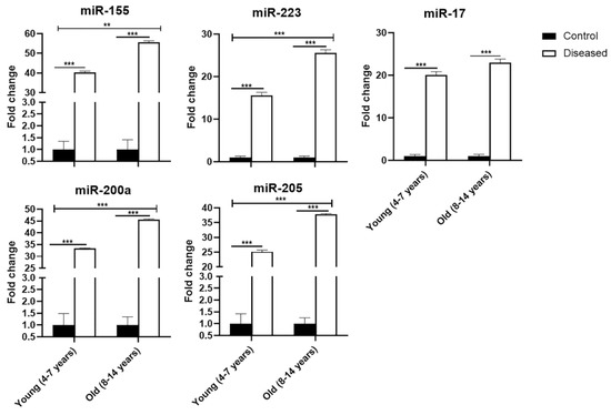 In Figure 3, the relative abundance of eca-miR-155, eca-miR-223, eca-miR-17, eca-miR-200a, and eca-miR-205 was higher p ≤ 0.001) in both young and old diseased mares, compared to control healthy mares (young and old). In old mares, eca-miR-155, eca-miR-223, eca-miR-200a, and eca-miR-205 revealed higher (0.001 ≤ p ≤ 0.01) expression than young diseased mares, as well as in all control mares.