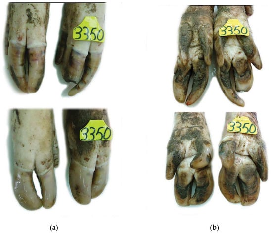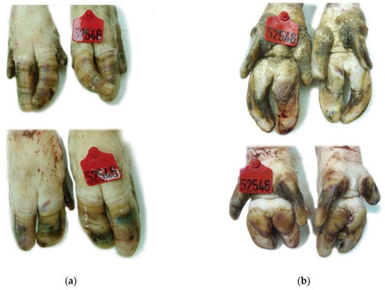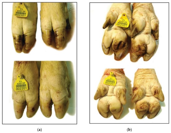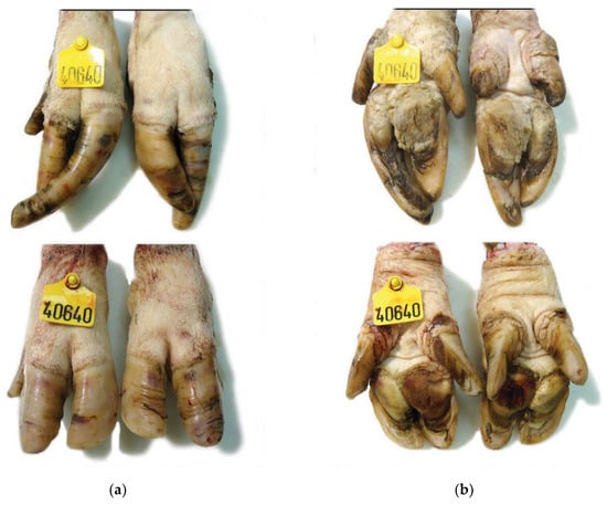 Claw lesions from a culled sow of genetic line C (Topigs): (a) Dorsal view: Normal length of the claws and few bruises and superficial cracks on an intact hoof wall; (b) Ventral view: Mild ulceration of the heel bulbs.