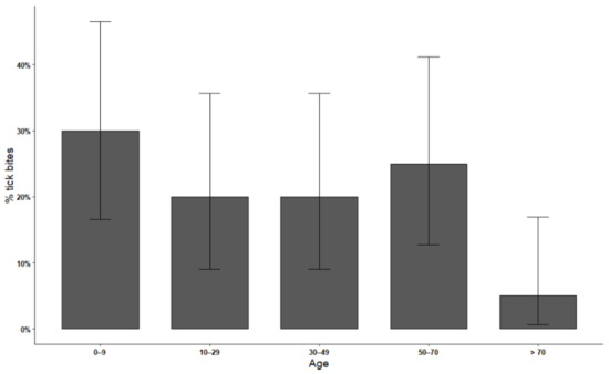 Prevalence of tick bites recorded in 2018–2019 by collaborating physicians, with 95% CI, according to age categories (in years).