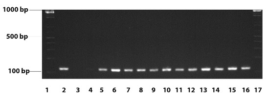 Representative PCR results of the amplification of the agaC gene of the D. congolensis isolates. Lanes 1 and 17—Molecular weight markers; Lane 2—positive control (D. congolensis ATCC: 14637); Lane 3—negative controls (no template DNA); Lane 4—negative control (no Taq polymerase) Lanes 5–16—D. congolensis isolates.