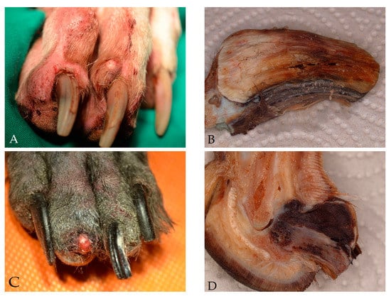 - Wobeser, B.K.; Kidney, B.A.; Powers, B.E.; Withrow, S.J.; Mayer, M.N.; Spinato, M.T.; Allen, A.L. Diagnoses and clinical outcomes associated with surgically amputated canine digits submitted to multiple veterinary diagnostic laboratories. Vet. Pathol. 2007, 44, 355–361. [Google Scholar] [CrossRef]