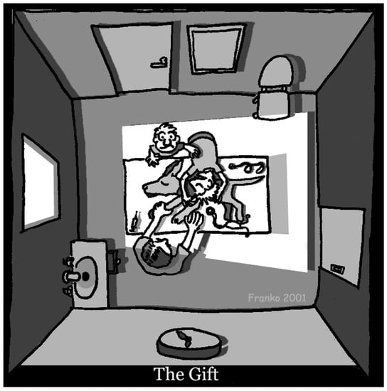 “The Gift”, a cartoon by veterinarian and illustrator Frank Gaschk (Figure 1), depicts the immediate aftermath of the euthanasia of a beloved pet dog. The dog lies peacefully on the table in the consulting room. The dog’s lead is curled up on the table, no longer needed. On one side of the table, a heartbroken owner is slumped over the body of the dog. Beside them, a person stands, one hand offering comfort to the other grief-stricken party as they look upwards, perhaps in a vain attempt to hold back tears, perhaps looking to a higher order for some sort of solace. On the other side of the table is the veterinarian, whose face we cannot see. One hand appears to be holding off the cephalic vein, the syringe now resting empty on the table.