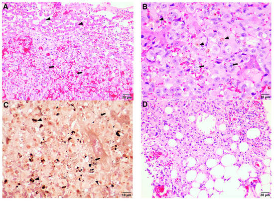Malignant melanoma, lion: histopathology of the liver and omentum. (A) Poorly defined proliferation of neoplastic cells (arrows), compressing a small area of non-neoplastic hepatocytes (arrowheads). (B) Pleomorphic round to oval to polygonal neoplastic cells with small to large amounts of pale eosinophilic finely vacuolar cytoplasm. Mitoses were present in all high power fields (arrows) and brown pigment-laden cells were common (arrowheads). (C) The pigment within the neoplastic cells stained typical for melanin using Fontana-Masson special stain. The melanin pigment varied from finely granular (arrows) to coarsely granular (arrowheads). (D) Proliferating neoplastic cells within the adipose tissue of the omentum.