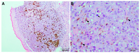 Malignant melanoma, lion: histopathology of the skin mass on the ear. (A) Proliferation of neoplastic cells in the dermis similar to those found in the liver and omentum. The neoplastic cells extend close to the epidermis and brown pigment is clearly visible. (B) Neoplastic cells similar to those found in the liver and omentum within the dermis containing brown cytoplasmic pigment (arrowheads). Note the mitotic figure (arrow).