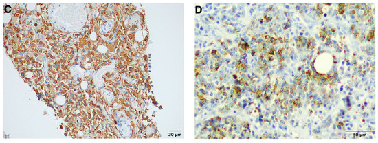 Based on the diagnosis of melanoma in the ear, a presumptive diagnosis of metastatic melanoma was made for the liver and omental masses. To further characterize the neoplastic cells, 4 μm serial sections of the paraffin blocks were cut and used for indirect immunohistochemistry. Antigen retrieval was performed by heat treatment in 10 mM citrate buffer, pH 6.0 for 15 min. Thereafter, sections were treated for 15 min with 3% hydrogen peroxide in methanol (to block endogenous peroxidases). They were then incubated for 2 h at room temperature with a mouse monoclonal PNL-2 antibody (1:300 dilution; Santa Cruz Biotechnology, Dallas, TX, USA) as a primary antibody, which is a marker that demonstrates high sensitivity for melanoma, with superior specificity to S-100 [8] and has been previously shown to be a sensitive marker for feline non-ocular melanocytic neoplasms [9]. Slides were then treated with a polymer detection kit as per the manufacturer’s instructions (Super Sensitive™ Polymer-HRP; Biogenex, Fremont, CA, USA). A Vector® NovaRED® Substrate Peroxidase Kit was used as a chromogen (Vector Laboratories, Burlingame, CA, USA), and the slides were then counter-stained using Mayer’s haematoxylin, dehydrated, and mounted with Entellan for evaluation via light microscopy. Sections of confirmed canine melanoma tissue were used as a positive control and negative internal dermal collagen was used for negative control purposes. The cutaneous mass (Figure 4A), the masses in the liver (Figure 4B), and those in the omentum (Figure 4C) stained strongly positive with PNL-2 compared to the positive control (Figure 4D). The location of the positive staining was predominantly cytoplasmic and constituted approximately 100% of the neoplastic population in all locations. Thus, a diagnosis of metastatic malignant cutaneous melanoma was made.