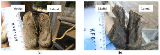 (a) Back foot with an undamaged hoof wall and perfect shape (Foot-level score for hoof wall conformation = 0); (b) Back foot with a severely misshapen and damaged hoof wall of the medial claw, and a moderately damaged lateral claw (Foot-level score for hoof wall conformation = 5).