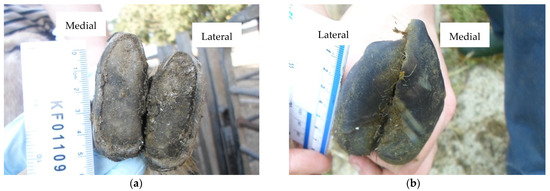 (a) Front foot with an undamaged sole and heel area and perfect shape (Foot-level score for sole and heel conformation = 0); (b) Front foot with a severely damaged sole and heel area of the medial claw (Foot-level score for sole and heel conformation = 3).