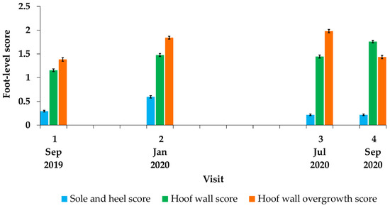 Foot-level scores for conformation traits varied by farm (p < 0.001); higher sole and heel scores were observed on Farm A, higher hoof wall scores were observed on Farm C, and higher hoof wall overgrowth scores were observed on Farm B. Foot-level scores also changed over time (p < 0.001); highest scores for sole and heel conformation were observed at Visit 2, highest scores for hoof wall conformation were observed at Visit 4, and highest scores for hoof wall overgrowth were observed at Visit 3 (Figure 4).