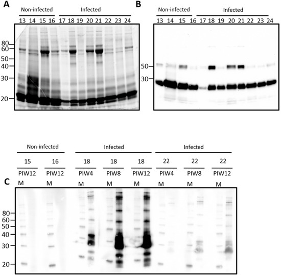Representative total protein content (A) or IgG detection (B) in rat urine. Urine was collected from outbred male rats at post-infection week (PIW) four after inoculation by the intraperitoneal route. Urinary IgG specific for leptospires was demonstrated in infected rats by immunoblotting of leptospires (C) with urine collected at PIW 4, 8, and 12 in infected rats (numbered 17–24) compared to non-infected controls (numbered 13–16). Molecular mass markers (M) are indicated in kDa.