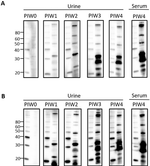 Given that urinary IgG specific for leptospires was clearly detected by PIW4, a time course was performed with urine collected from intraperitoneally infected rats at weekly time points from PIW0 to PIW4. Representative immunoblots showed that urinary IgG was detected as early as PIW1, and increased over time, as seen in Figure 2A,B.