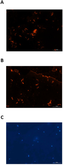 A 10-µL aliquot of rat urine was placed on a glass slide with a 7-mm well, performed in duplicate. Urine was allowed to air dry in the dark and fixed in acetone for 15 min at RT. Slides were placed in a humid chamber and 20 µL of rat serum (post-infection week 8) or 20 µL of urine (post-infection week 4 and post-infection week 8) from a chronically infected rat, diluted 1 in 100 in PBS, was added to each well. Slides were incubated at 37 °C for 1 h. Slides were washed for 10 min in PBS at RT with gentle rocking. Slides were dried and 50 µL of donkey α-rat IgG-Alexa 594 (Invitrogen, Carlsbad, CA, USA) at 1 in 1000 dilution, and 10 µL of 4’,6-diamidino-2-phenylindole (DAPI) (1 in 500 in PBS) was applied to each well. Slides were incubated at 37 °C for 1 h. Slides were washed for 10 min in PBS at RT with gentle rocking. To determine if urinary-derived antibodies were bound to urinary-derived leptospires, slides were also tested directly with donkey α-rat IgG-Alexa 594 (Invitrogen, Carlsbad, CA, USA). Slides were also tested with serum and urine from non-infected control rats. Slides were dried and coverslip mounted with 20 µL of ProLong Gold antifade reagent (Invitrogen, Carlsbad, CA, USA), diluted 1 in 3 in PBS, which allowed them to cure overnight in the dark. Staining was evaluated at 400X with a BioTek® Cytation 5 imaging reader (Winooski, VT, USA) using Fluorescein isothiocyanate (FITC) (excitation, 450−490 nm, emission, 520 nm), Texas Red (excitation, 560 nm, emission, 600 nm), and DAPI (excitation, 356nm, emission, 409 nm) fluorescent filters.