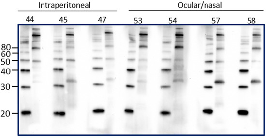Detection of urinary IgG specific for leptospires in urine from inbred female rats experimentally infected using the intraperitoneal route compared to the ocular/nasal route. Representative immunoblots of leptospires with urine collected at PIW4. Molecular mass markers (M) are indicated in kDa and are shown in the left lane of each immunoblot compared to antigen of leptospires in the right lane.