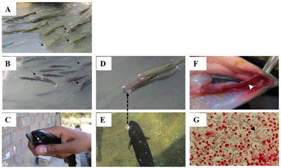 Lactococcosis, caused by L. garvieae, is a systemic hyperacute bacterial disease causing general hemorrhagic symptoms in susceptible aquatic organisms [24,25]. Based on their ability to agglutinate serum raised against L. garvieae, there are two groups of bacterial serotypes: non-agglutinating (KG−) and agglutinating (KG+) phenotypes [26]. The affected fish first become relatively anorexic, with a visible darkening of skin color, showing sluggish movement and abnormal behaviors, such as erratic and spiral swimming [11,24]. In the later stages of the disease the affected fish display signs of swollen abdomen, anal prolapsus, lateral or bilateral exophthalmia (Figure 1A,B), cataracts (Figure 1C), congestion of the internal organs, spleen and liver enlargement, accumulation of turbid ascitic fluid in the peritoneal cavity, and the presence of exudates in the brain [11,22,27,28]. Acute hyperemia and or extensive hemorrhage and petechiae of the organs, including the mucosal layers of the intestine, can also be seen in the diseased fish (Figure 1F), and in some cases the diseased fish show signs of explosion in the eyes prior to the loss of their eyes (Figure 1D,E) [11,22,29]. In advanced forms of the disease, a Gram stain preparation of hematopoietic tissue imprints, including spleen and kidney, can exhibit huge numbers of Gram-positive coccoid cells in single or chain forms (Figure 1G).