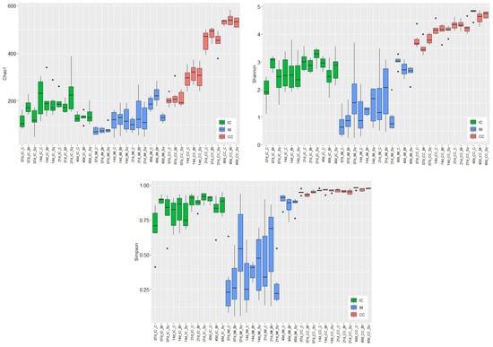 Effects of dietary treatments (C—Control, Br—Broilact®, Sy—Synbiotic feed additive) and age of birds on the alpha diversity of ileal chymus (IC), ileal mucosa (IM), and caecal chymus (CC) microbiota in broiler chickens. Boxplots representing alpha diversity by Chao1 estimator, Shannon, and Simpson indexes. Boxes represent the median, the 25th, and the 75th percentiles of the groups. Alpha diversity indices at different taxonomical levels and in different intestinal samples (IC, IM, and CC) were compared using two-way ANOVA test with Tukey’s HSD multiple group comparison’s post hoc test, using the dietary treatments (C, Br and Sy) and the age of birds (7, 14, 21, and 40 day) as main factors. The differences were considered significant at a level of p ≤ 0.05. Dots represent the outlier values.