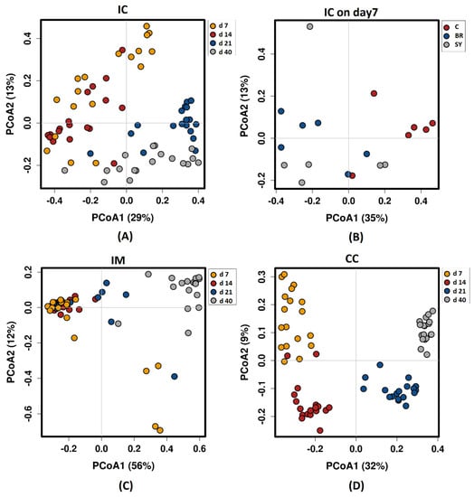 Principal coordinate analysis (PCoA) based on Bray—Curtis dissimilarity matrix on sampling sites: (A) Ileal chymus age effect; (B) Ileal chymus dietary treatment effect at d 7; (C) Ileal mucosa age effect; (D) Caecal chymus age effect. Dietary treatments were C—Control, Br—Broilact®, Sy—Synbiotic feed additive. The percentage of variation explained by each PCoA is indicated on the axes with Bray—Curtis dissimilarity. To verify the significance of bacterial community analysis of similarities (ANOSIM) calculations were performed with 999 permutations. The differences were considered significant at a level of p ≤ 0.05.