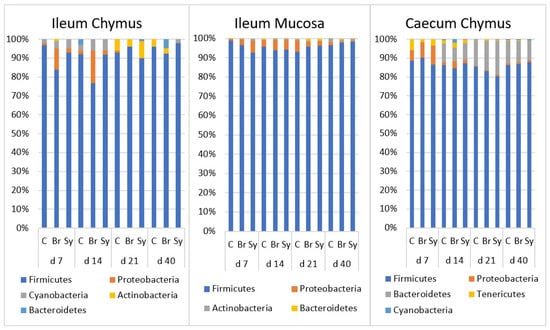 The relative abundance of microbiota at phylum level in the ileal chymus (IC), ileal mucosa (IM), and caecal chymus (CC) as affected by the age of chickens and dietary treatments (C—Control, Br—Broilact®, Sy—Synbiotic feed additive). Microbial composition at different taxonomical levels and in different intestinal samples (IC, IM and CC) were compared using two-way ANOVA test with Tukey’s HSD multiple group comparison’s post hoc test, using the dietary treatments (C, Br and Sy) and the age of birds (7, 14, 21, and 40 day) as main factors. The differences were considered significant at a level of p ≤ 0.05.