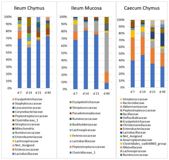 In our case, Ruminococcaceae, Lachnospiraceae, and Lactobacillaceae were the main families in the caecum, constituting about 70% of the total families. Compared to the other studies [,,], in our experiments, Lactobacillaceae was present at a higher percentage.