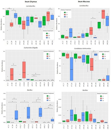 Boxplots showing the abundances of the taxonomic groups at genus level in the ileal chymus (IC) and ileal mucosa (IM) as affected by the dietary treatments and age of birds. Statistical significance was determined by one-way ANOVA and the Tukey multiple-comparisons test. Results with an adjusted p-value below 0.05 (* p < 0.05; ** p < 0.01; were considered statistically significant and results between 0.05 and 0.1 (0.05 < p < 0.10) were considered a trend (T). Dots represent the outlier values.