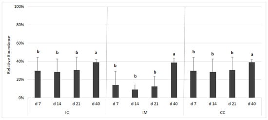 Proteobacteria was one of the minor phyla in all three gut areas with a decreasing relative abundance over time. In IC and IM, its relative abundance was significantly higher at d 14 (p < 0.05) and dropped below 1% later on in IC. Its decrease was slower in the IM and decreased below 1% only at d 40. In CC, the relative abundance was significantly higher at d 7 (p < 0.0001) and decreased over time.