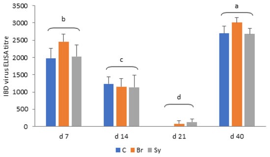 Infectious bursal disease (IBD) virus ELISA antibody titres in different treatment groups (mean ± SD). C—Control, Br—Broilact®, Sy—Synbiotic feed additive; All p-values were calculated using two-sided tests and corrected with BH-FDR correction. FDR p-value less than 0.05 was considered statistically significant. a, b, c, d: Averages with different letter marks differ significantly (p < 0.05).