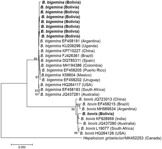 - Dueñez, J.J.; Chávez, O.T.; Rocha, A.H.; Castaño, A.T.; Jaramillo, A.M.M. Molecular surveillance and phylogenetic traits of Babesia bigemina and Babesia bovis in cattle (Bos taurus) and water buffaloes (Bubalus bubalis) from Colombia. Parasites Vectors 2018, 11, 510. [Google Scholar] [CrossRef]