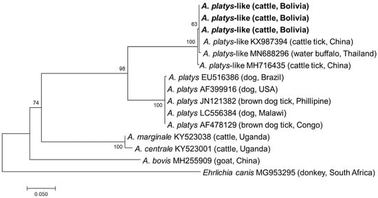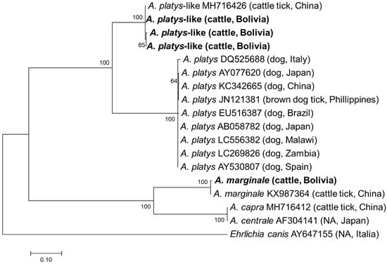 - Nguyen, A.H.L.; Tiawsirisup, S.; Kaewthamasorn, M. Molecular detection and genetic characterization of Anaplasma marginale and Anaplasma platys-like (Rickettsiales: Anaplasmataceae) in water buffalo from eight provinces of Thailand. BMC Vet. Res. 2020, 16, 380. [Google Scholar] [CrossRef] [PubMed]