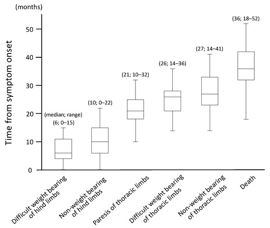 In total, 40 dogs were included in this study. Among them, 26 dogs were male, 21 of which were castrated, and 14 dogs were female, nine of which were spayed. The median age of onset was 10 years and eight months old (range: seven years and seven months to 14 years old). The median age at death was 13 years and nine months old (range: 10 years and three months to 16 years and one month old), and the median survival time (date of symptom onset until date of death) was 36 months (range: 18 to 52 months). All dogs were homozygous for the c.118G>A mutation in the SOD1 gene.
